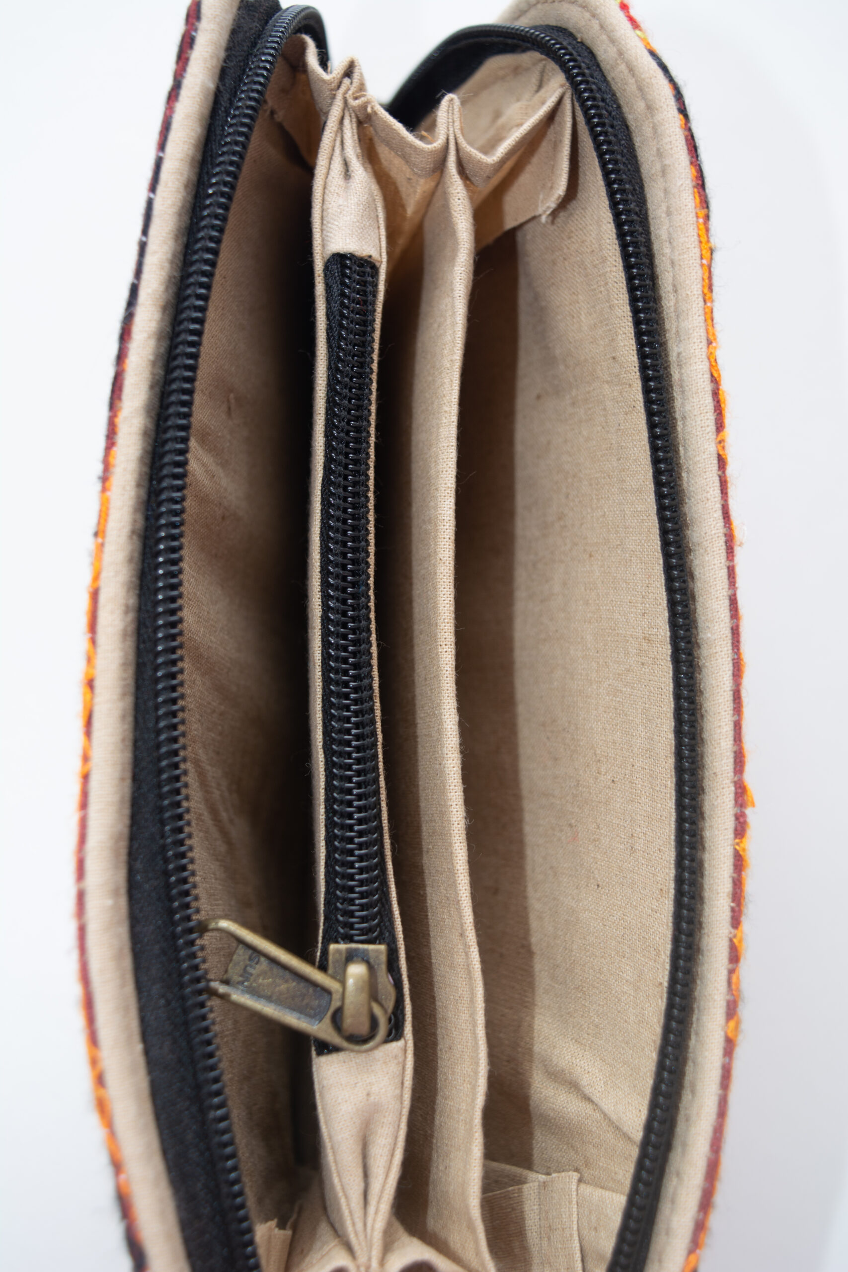 The Banjara Patchwork Clutch are made by rural artisians of Rajasthan using vintage Banjara embroidered cloth, leather tassels, shells, zari and mirror-work pieces – placed and stitched together to create a vibrant and colourful handbag. The bag includes Banjara Embroided shoulder strap. Zipper inside the bag ensures safety and durabillity of the bag.